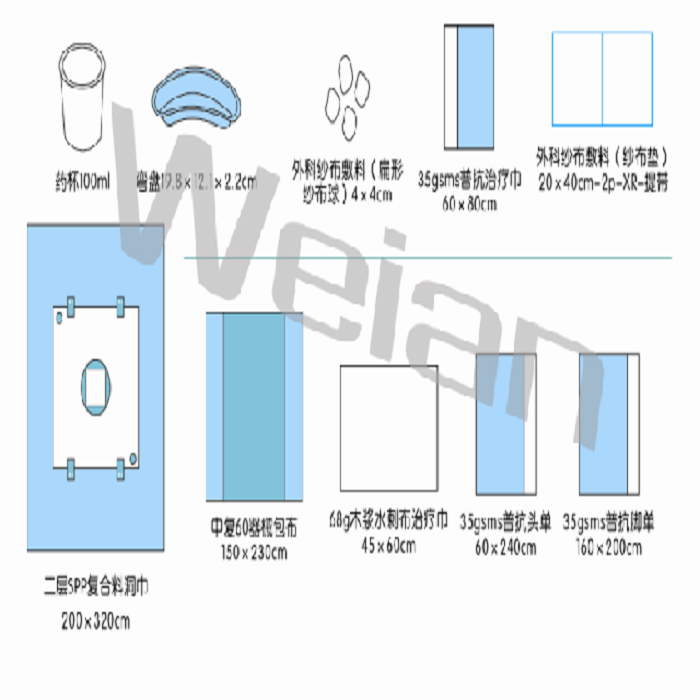 | 成份 | 基本配置:手术单,选配产品:纱布垫、弯盘、纱布球、药杯、治疗巾、包布。 |