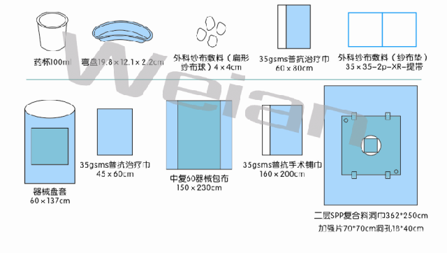 | 成份 | 基本配置:手术单。选配产品;盘套、弯盘、治疗巾、药杯、纱布球、纱布垫、手术铺单、洞巾、仪器套、包布。 |